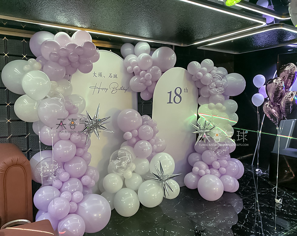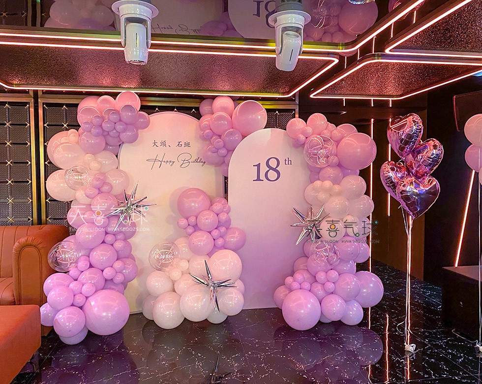 KTV 18岁生日派对布置案例,以紫色马卡龙气球为主,搭配金色、白色点缀,营造优雅与梦幻兼具的庆生氛围。香芋紫爱心氦气球,打造专属拍照打卡区。