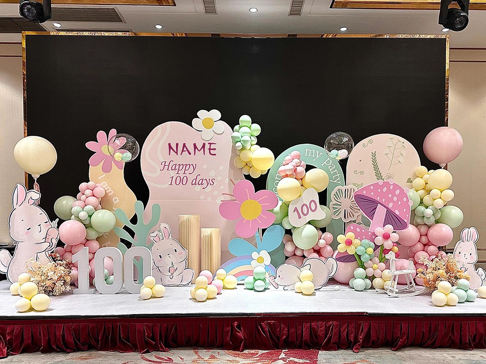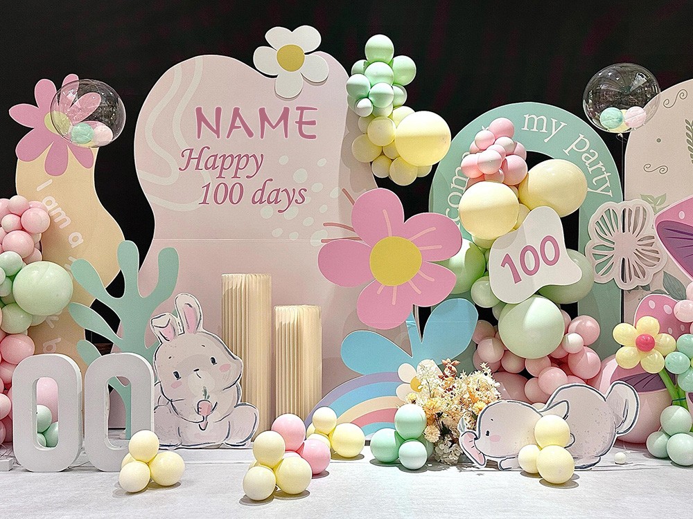 我们特别设计了一面花朵背景墙,将宝宝的名字和100天祝福融合在背景上,旁边点缀着可爱的卡通花朵、蝴蝶和兔子等元素,成为大家合影的理想背景,记录下这难忘的时刻。