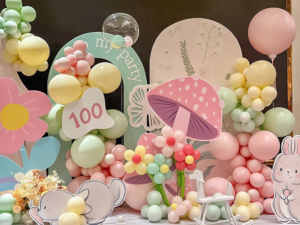 在这个特殊的时刻,我们为女宝宝100天庆祝活动精心布置了一个充满童趣和温馨氛围的场地,让每一个瞬间都充满爱的印记!本次场地布置采用了卡通元素设计,搭配马卡龙色气球,让庆祝现场呈现出一个梦幻童话般的世界,充满了可爱的兔子、蘑菇、花朵等元素,带给大家欢声笑语和甜蜜的回忆。